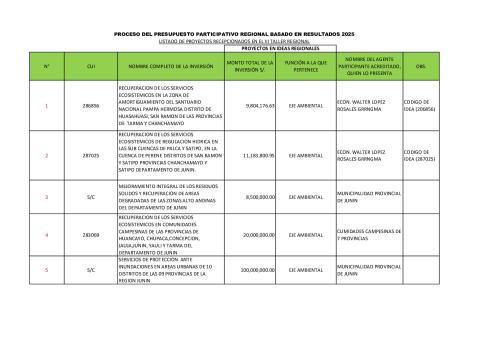 La información contiene el listado de proyectos de inversión regionales , proyectos provinciales e ideas regionales del eje ambiental . a ser priorizados en el Presupuesto participativo 2025