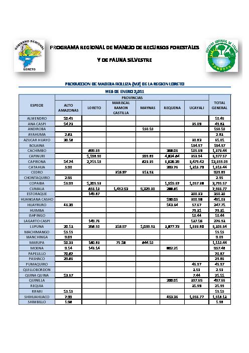 El presente documento estadístico elaborado por el Programa Regional de Manejo de Recursos Forestales y de Fauna Silvestre-PRMRFFS, informa que la producción de madera rolliza en la Región Loreto del mes de Enero del 2011 fue la siguiente: Que la Provincia de Requena fue la de mayor producción alcanzando para ello una producción de 18,892.17 m3 lo que representa el 37% de la producción total en la Región Loreto que fue de 51,527.20 m3, siendo la especie Capirona la de mayor producción con 6,626.39m3 lo que representa el 35% de la producción dado en al Provincia de Requena.