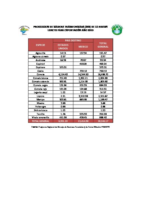 El presente documento que contiene información estadística fue elaborado por el Programa Regional de Manejo de Recursos Forestales y de Fauna Silvestre, en donde se da a conocer la producción de madera transformada en la Región Loreto que fue exportada el año 2010 siendo un total de 30,346.17m3 de madera transformada exportada, de las cuales el país de México fue nuestro mayor mercado exportando un total de 23,414.98m3 lo que representa el 77% de madera exportada en el año 2010.