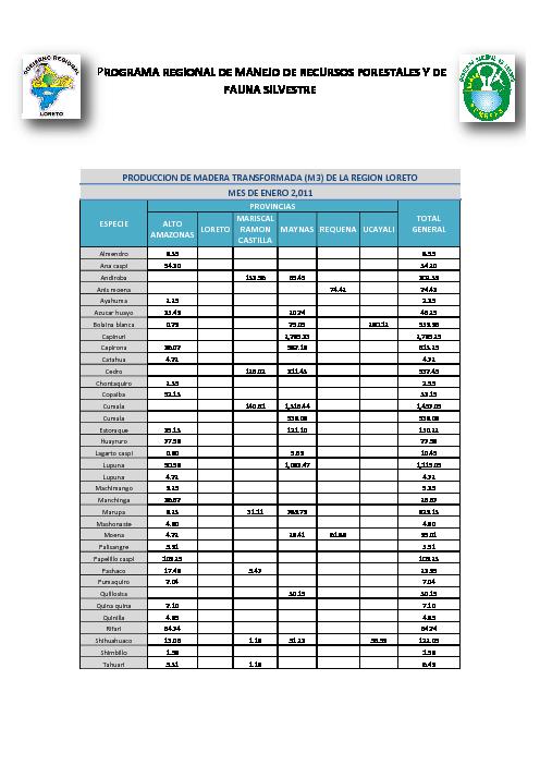 El presente documento que contiene información estadística fue elaborado por el Programa Regional de Manejo de Recursos Forestales y de Fauna Silvestre, en donde se da a conocer la producción de madera transformada en la Región Loreto en el mes de Enero del 2011 siendo un total de 10,152.75 m3 de madera transformada de las cuales la Provincia de Maynas fue la que mayor producción tuvo con un total de 8,120.78 m3 lo que representa el 80% de la producción total, siendo la especie Capinuri la de mayor producción con 2,783.23m3.