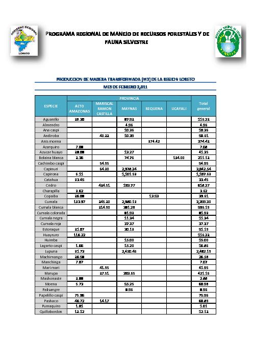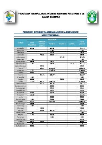 El presente documento que contiene información estadística fue elaborado por el Programa Regional de Manejo de Recursos Forestales y de Fauna Silvestre, en donde se da a conocer la producción de madera transformada en la Región Loreto en el mes de Febrero del 2011 siendo un total de 15,695.97 m3 de madera transformada de las cuales la Provincia de Maynas fue la que mayor producción tuvo con un total de 12,171.13m3 lo que representa el 77% de la producción total, siendo la especie Cumala la de mayor producción con 2,980.13m3 y la especie Pumaquiro la de menor producción con 1.01 m3.