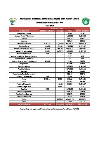 El presente documento estadístico fue elaborado por el Programa Regional de Manejo de Recursos Forestales y de Fauna Silvestre, informa la producción de madera tranformadapor producto y su destino final de aprovechamiento de la Región Loreto el año 2010, pudiéndose constatar que el destino final del producto forestales transformado fue el PERÚ con 148.113.52 m3, de un total de 178.459.69 m3, lo que representa el 82%, seguido por el País de Mexico con 23.414.98 m3. Así como que el prodcuto forestal transformado de mayor producción y demanda fue madera aserrada con 53.478.22m3 lo que representa un 36% del total de madera transformada de lo que se aprovecho en el PERÚ.