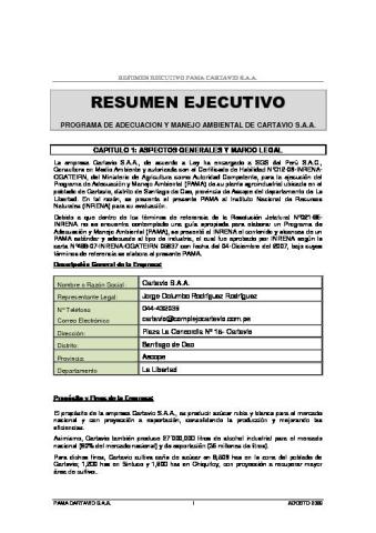La empresa Cartavio S.A.A., de acuerdo a Ley ha encargado a SGS del Perú S.A.C., Consultora en Medio Ambiente y autorizada con el Certificado de Habilidad N°012-06-INRENA-OGATEIRN, del Ministerio de Agricultura como Autoridad Competente, para la ejecución del Programa de Adecuación y Manejo Ambiental (PAMA) de su planta agroindustrial ubicada en el poblado de Cartavio, distrito de Santiago de Cao, provincia de Ascope del departamento de La Libertad. En tal razón, se presenta el presente PAMA al Instituto Nacional de Recursos Naturales (INRENA) para su evaluación.
