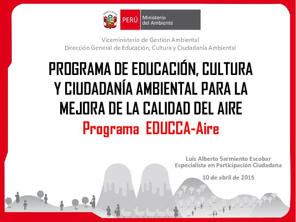 Esta presentación realizada por Luis Alberto Sarmiento Escobar de la Dirección General de Educación, Cultura y Ciudadanía Ambiental del Ministerio del Ambiente de acuerdo a los términos de referencia de la consultoría, la línea base a obtener permitió contar con información ambiental actualizada, que sirvió de orientación básica para los niveles nacional, regional y local, fundamentándose en un análisis y evaluación de las percepciones de la ciudadanía sobre el grado de la contaminación ambiental atmosférica en las 13 ciudades priorizadas por el MINAM.