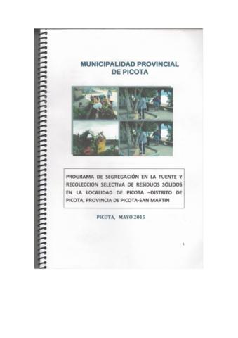 El presente programa, expone un gran compromiso con la ecoeficiencia municipal de mejorar el manejo de Residuos Sólidos municipales del distrito de Picota, que ten drán como fase desde la generación de Residuos Sólidos hasta la disposición final segura.