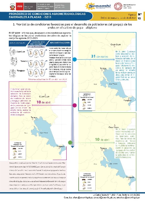 "Pronóstico de condiciones agrometeorológicas favorables para plagas (Kcona Kcona y Gorgojo de los andes) N° 12" .