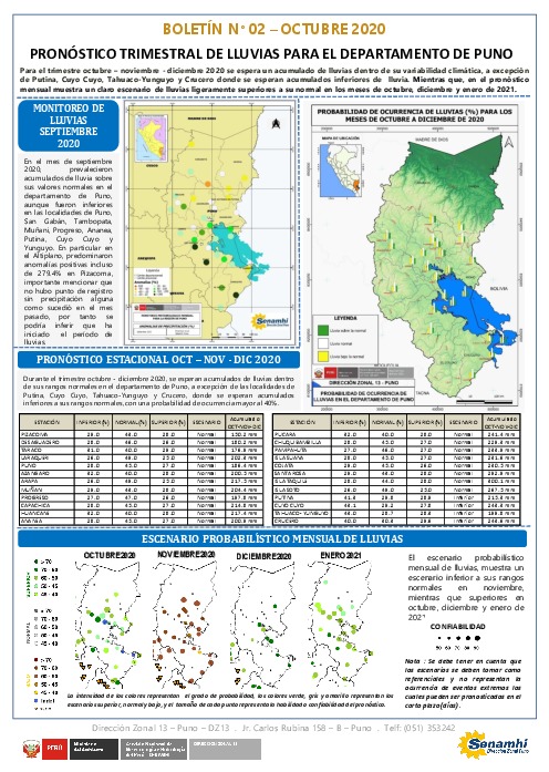 PRONÓSTICO TRIMESTRAL DE LLUVIAS PARA EL DEPARTAMENTO DE PUNO BOLETÍN N° 02 – OCTUBRE 2020