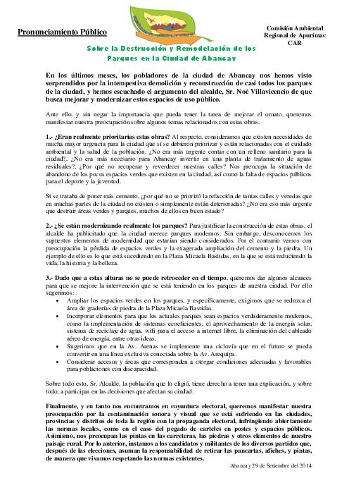 Pronunciamiento Público CAR Apurímac: Sobre la Destrucción y Remodelación de los Parques en la Ciudad de Abancay