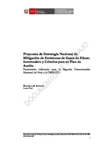 Este documento se ha preparado como parte de la Segunda Comunicación Nacional del Perú a la Convención Marco de las Naciones Unidas sobre Cambio Climático. Se ha desarrollado sobre la base de la información recopilada en los diversos estudios encargados para completar la estrategia, y sobre reuniones iniciales de coordinación y entrevistas a miembros de las organizaciones de la administración pública involucradas en su implementación. Busca formular una propuesta inicial de estrategia nacional de mitigación e incluye además los principales considerandos de un plan de acción.
