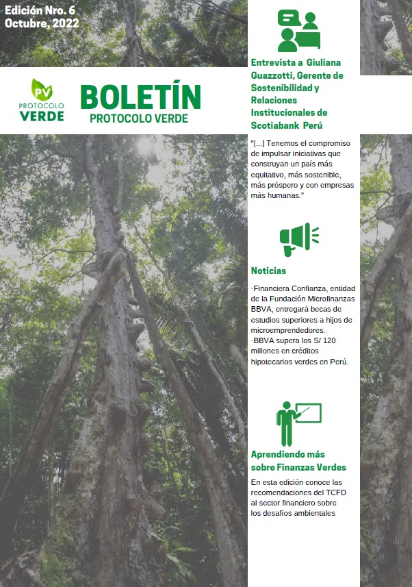 El Boletín Informativo se desarrolla en el marco del Protocolo Verde, el cual es un acuerdo de colaboración entre el sector público y el sector financiero peruano, que impulsará el desarrollo económico y financiero sostenible del país. Las instituciones adheridas podrán realizar el análisis y evaluación de riesgos sociales y ambientales e integrarlos en sus operaciones crediticias y de inversión; desarrollar un portafolio de productos y servicios verdes y aplicar la ecoeficiencia al interior de sus organizaciones.