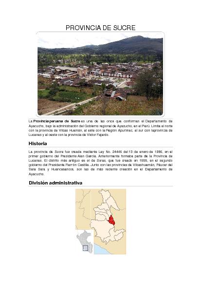 La Provincia peruana de Sucre es una de las once que conforman el Departamento de Ayacucho, bajo la administración del Gobierno regional de Ayacucho, en el Perú. Limita al norte con la provincia de Vilcas Huamán, al este con la Región Apurímac, al sur con laprovincia de Lucanas y al oeste con la provincia de Víctor Fajardo.