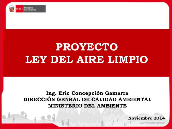 Esta presentación realizada por el Ing. Eric Concepción Gamarra de la Dirección General de Calidad Ambiental del Ministerio del Ambiente en noviembre del 2014. La presente ley busca establecer el marco legal que permita una adecuada gestión de la calidad del aire, a fin de alcanzar un ambiente equilibrado que contemple la protección de la salud, de los ecosistemas, la biodiversidad y que contribuya al desarrollo sostenible del país.