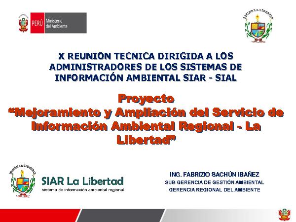 Presentación realizada en la X Reunión Técnica dirigida a los Administradores de los Sistemas de Información Ambiental SIAR - SIAL, por el Ing. Fabrizio Sachún Ibañez, especialista de la Gerencia Regional del Ambiente - La Libertad, en la cuidad de Ayacucho. La Reunión Técnica se llevó a cabo los días 25 y 26 de Mayo, organizado por el Ministerio del Ambiente.