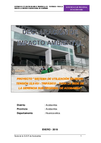 El proyecto consiste en la construcción de una red de eléctrica en media tensión para dotar de energía trifásica a la Sede de la Gerencia Sub Regional (G.S.R) de Acobamba perteneciente al Gobierno Regional de Huancavelica. La Sede de la Gerencia Sub Regional se encuentra ubicado en el distrito de Acobamba, provincia de Acobamba, departamento de Huancavelica. El presente expediente técnico tiene por finalidad evaluar los impactos ambientales generados en las diferentes etapas del proyecto (Construcción, Operación, Cierre y/o Abandono), con la finalidad de adoptar medidas preventivas y correctivas para mitigar posibles daños al ambiente, evitar la generación de pasivos ambientales y poder obtener la certificación ambiental del sector de energía.