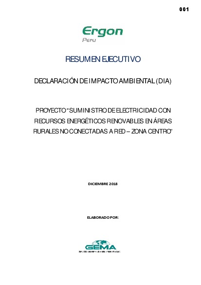 ERGON PERÚ S.A.C. (en adelante ERGON), empresa que se encuentra a cargo del proyecto de electrificación rural: “Suministro de Electricidad con Recursos Energéticos Renovables en Áreas No Conectadas a Red – Zona Centro” (en adelante Proyecto), presenta la Declaración de Impacto Ambiental del mismo, con la finalidad de dotar de energía eléctrica a predios rurales de distintas localidades y/o centros poblados del centro del país que no se encuentren conectados al Sistema Eléctrico Interconectado Nacional.