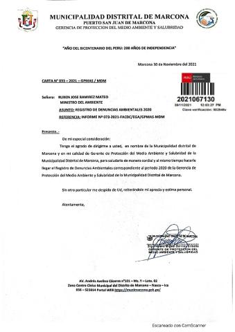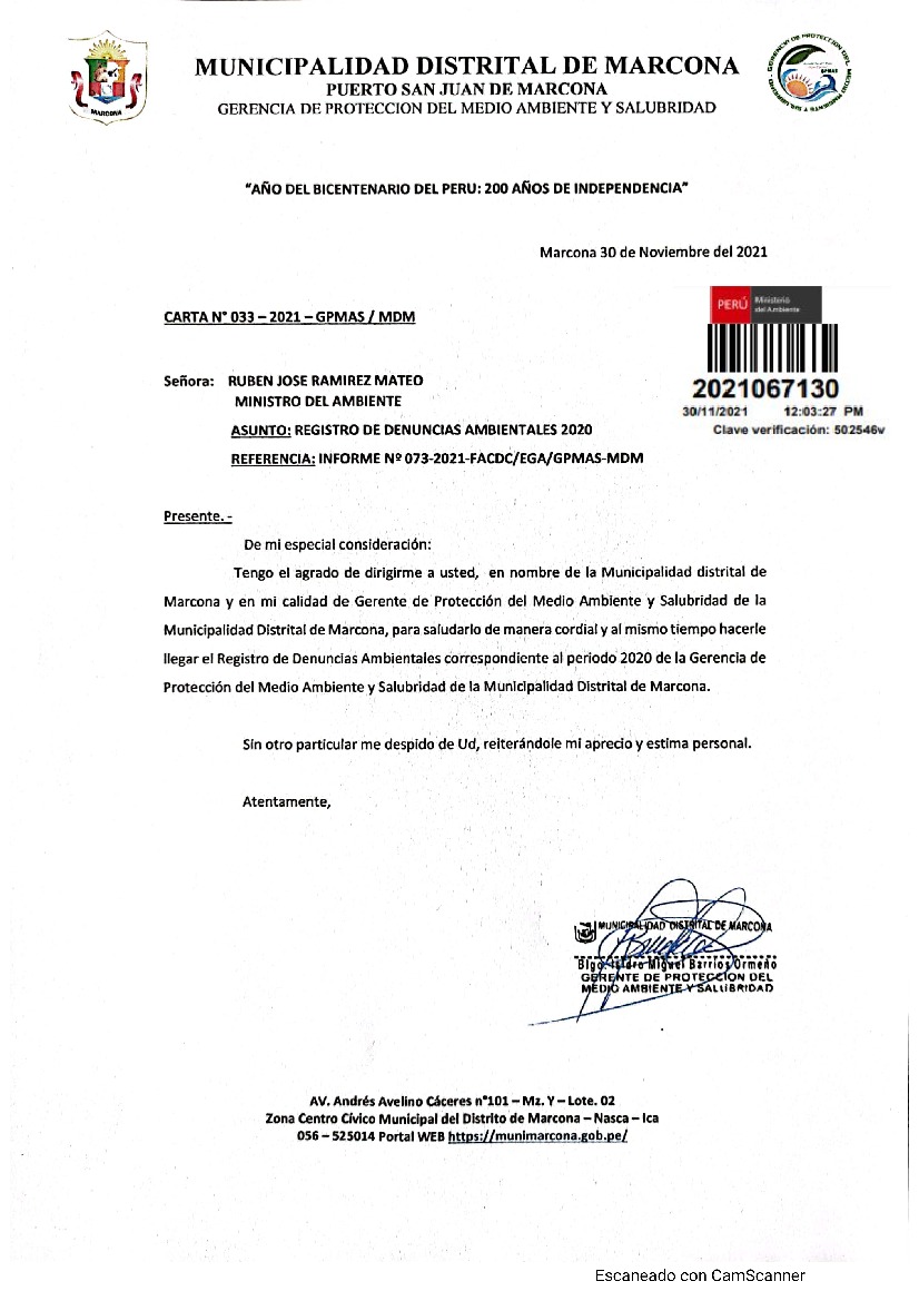 registro de denuncias ambientales 2020 de la Municipalidad Distrital de Marcona
