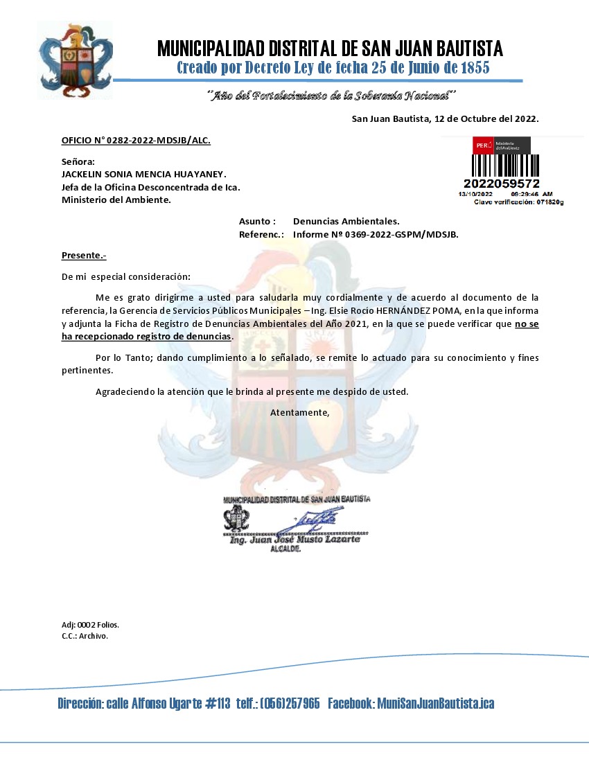 La entidad remite al Ministerio del Ambiente información sobre las denuncias ambientales en cumplimiento de lo establecido en el Decreto Legislativo N° 1055 que modifica el artículo 43° de la Ley N° 28611, que indica que "Las entidades deberán enviar anualmente un listado con las denuncias recibidas y soluciones alcanzadas, con la finalidad de hacer pública esta información a la población a través del SINIA".