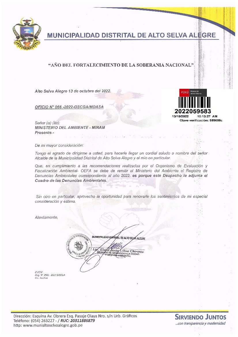 La entidad remite al Ministerio del Ambiente información sobre las denuncias ambientales en cumplimiento de lo establecido en el Decreto Legislativo N° 1055 que modifica el artículo 43° de la Ley N° 28611, que indica que "Las entidades deberán enviar anualmente un listado con las denuncias recibidas y soluciones alcanzadas, con la finalidad de hacer pública esta información a la población a través del SINIA".