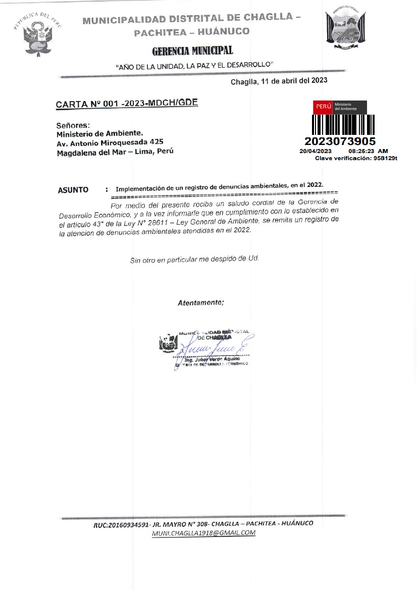 Registro de denuncias ambientales 2022 de la Municipalidad Distrital de Chaglla - Pachitea - Huánuco