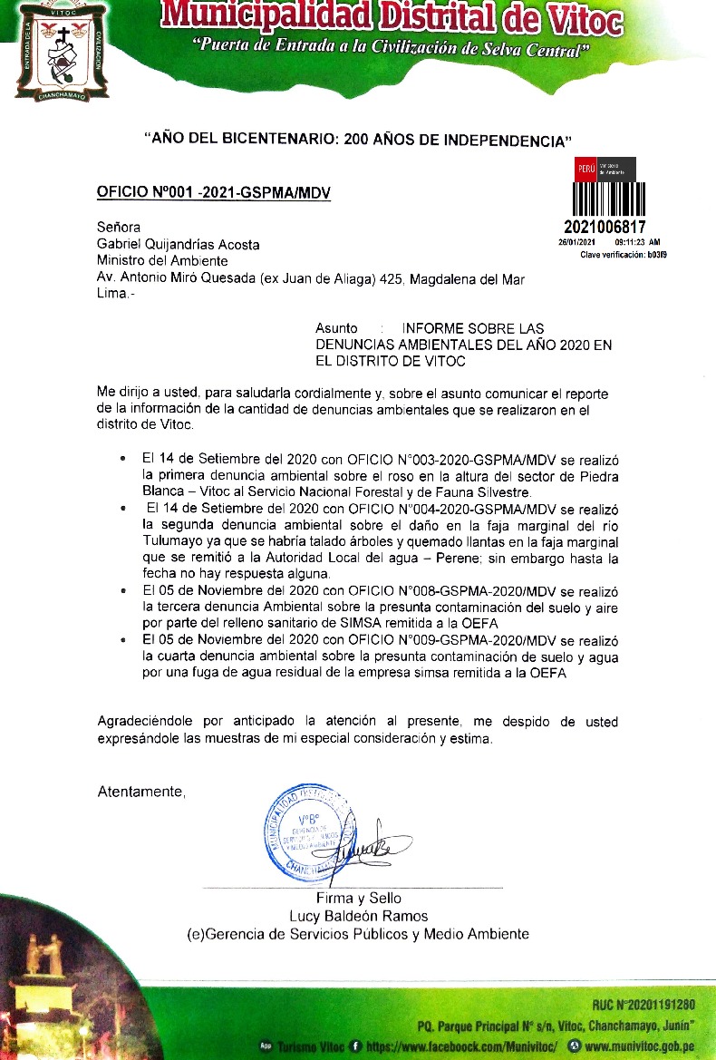 Registro de denuncias ambientales correspondientes al año 2020 de la Municipalidad Distrital de Vitoc