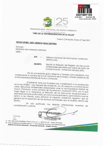 Registro de denuncias ambientales correspondientes al año 2020 de la Municipalidad Distrital de Nuevo Chimbote