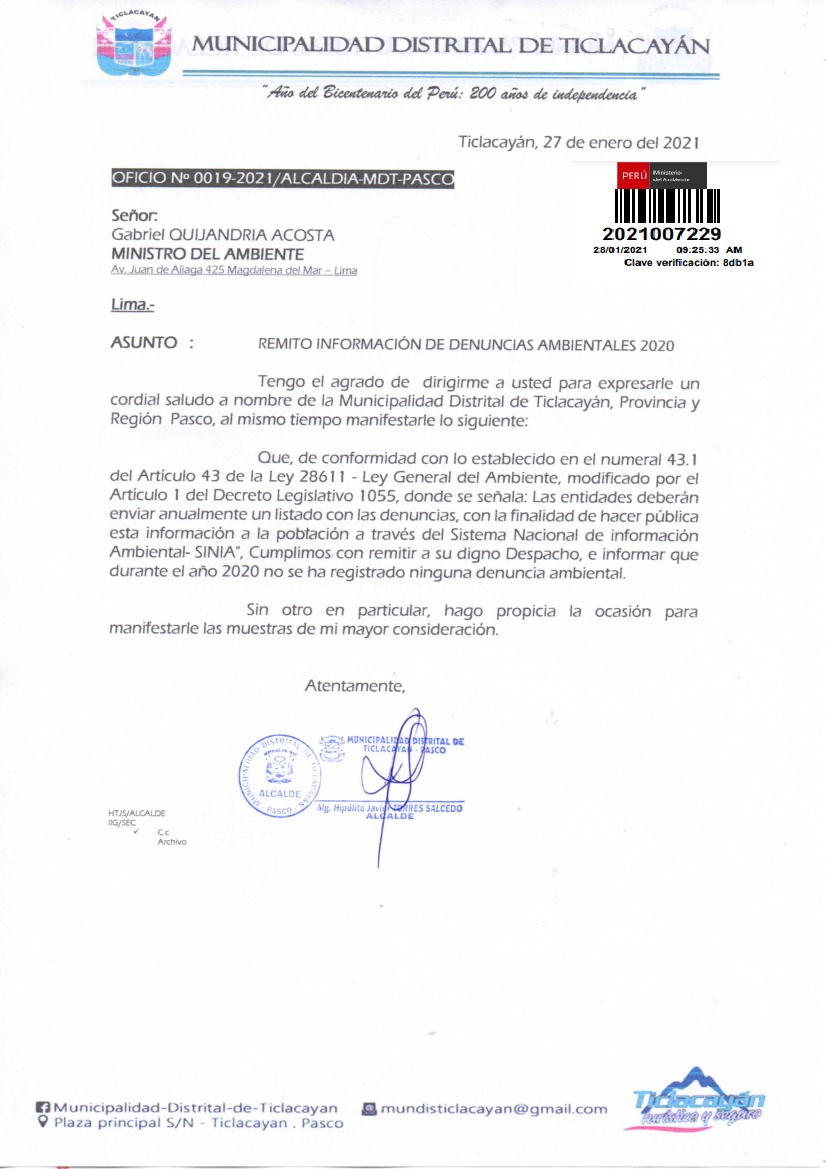 Registro de denuncias ambientales correspondientes al año 2020 de la Municipalidad Distrital de Ticlayán