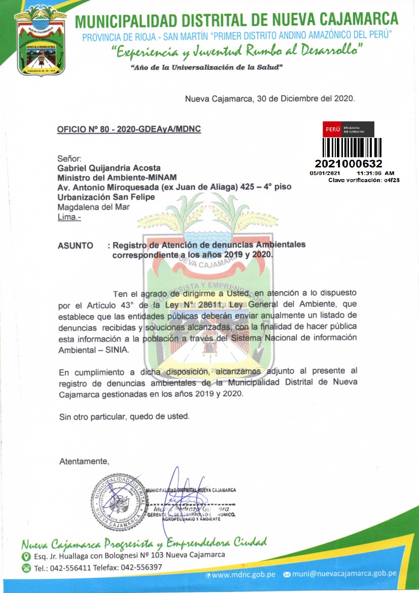 Registro de denuncias ambientales correspondientes a los años 2019 y 2020 de la Municipalidad Distrital de Nueva Cajamarca
