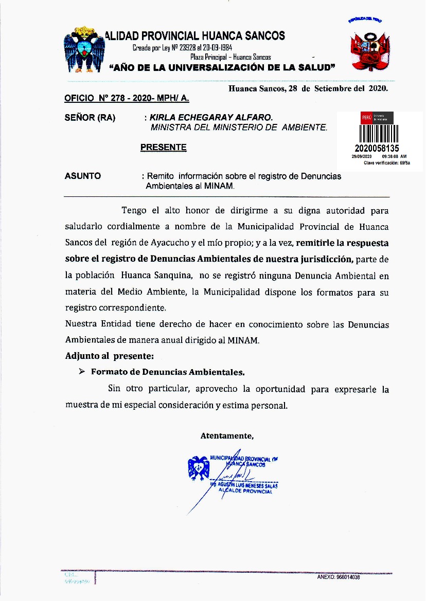 Registro de denuncias ambientales Municipalidad Provincial de Huanca Sancos