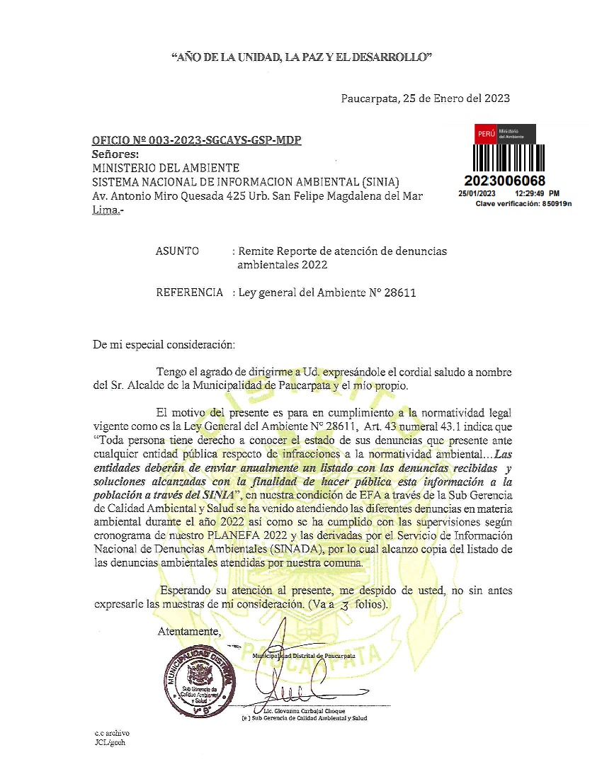 La entidad remite al Ministerio del Ambiente información sobre las denuncias ambientales en cumplimiento de lo establecido en el Decreto Legislativo N° 1055 que modifica el artículo 43° de la Ley N° 28611, que indica que "Las entidades deberán enviar anualmente un listado con las denuncias recibidas y soluciones alcanzadas, con la finalidad de hacer pública esta información a la población a través del SINIA".
