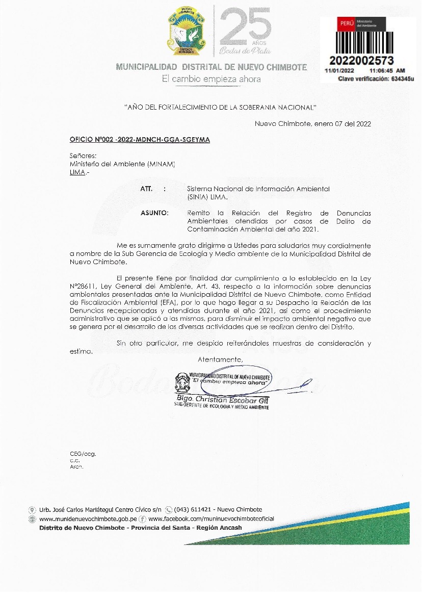 Relacion de denuncias ambientales atendidas por el caso de delito de contaminacion ambiental del año 2021 de la Municipalidad Distrital de Nuevo Chimbote