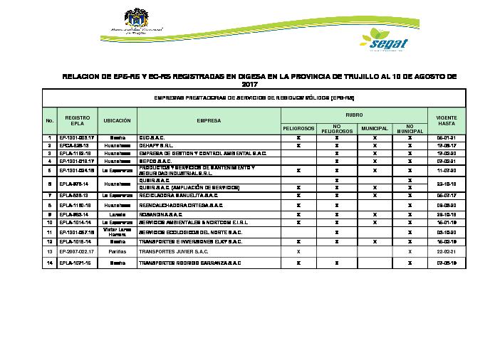 Relación de EPS-RS y EC-RS registradas en DIGESA en la provincia de Trujillo al 10 de Agosto de 2017