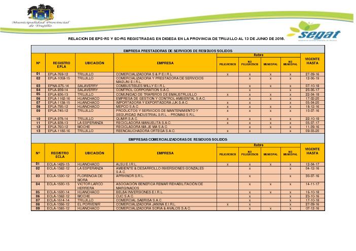 Relación de EPS-RS y EC-RS registradas en DIGESA en la provincia de Trujillo al 13 de Junio de 2016