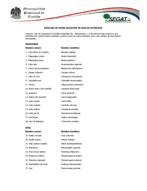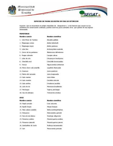 Relación de fauna silvestre en peligro en el Perú