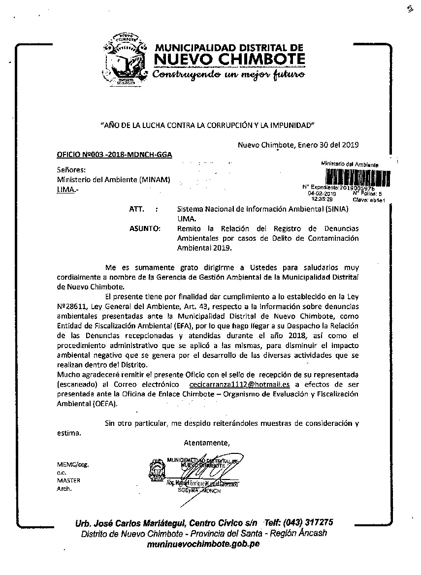 Relación del Registro de Denuncias Ambientales por casos de Delito de Contaminación Ambiental 2018 Distrito de Nuevo Chimbote