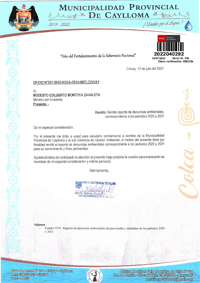 Remito reporte de denuncias ambientales, correspondiente a los periodos 2020 y 2021 de la Municipalidad Provincial de Caylloma
