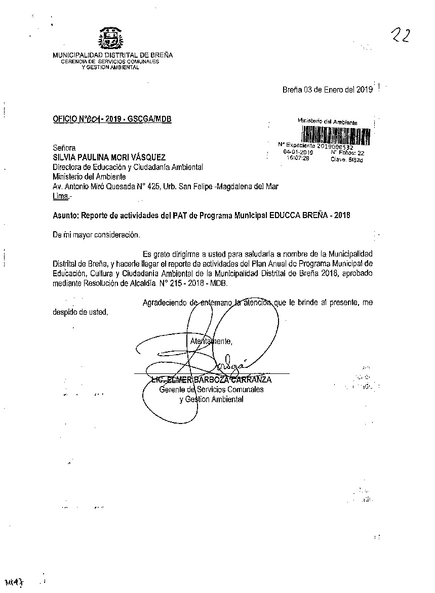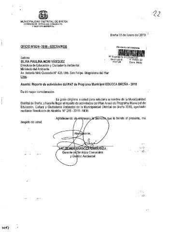 Y de acuerdo al instructivo para elaborar e implementar del Programa Municipal de EDUCCA (Resolución Ministerial N°456- 2018- MINAM), la Municipalidad Distrital de Breña remite al MINAM las actividades desarrolladas el 2018 en el marco del Programa Municipal EDUCCA-BREÑA, aprobado mediante Ordenanza N° 500-2018-MDB de fecha 13 de enero del 2018