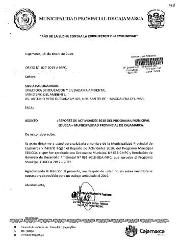 Y de acuerdo al instructivo para elaborar e implementar del Programa Municipal de EDUCCA (Resolución Ministerial N°456- 2018- MINAM), la Municipalidad Provincial de Cajamarca remite al MINAM las actividades desarrolladas el 2018 en el marco del Programa Municipal EDUCCA- Cajamarca aprobado con Ordenanza Municipal N° 631-2017-CMPC el 07 de diciembre del 2017.