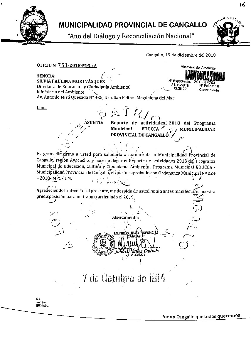 Y de acuerdo al instructivo para elaborar e implementar del Programa Municipal de EDUCCA (Resolución Ministerial N°456- 2018- MINAM), la Municipalidad Provincial de Cangallo remite al MINAM las actividades desarrolladas el 2018 en el marco del Programa Municipal EDUCCA- Cangallo aprobado con Ordenanza Municipal N° 024-2018-MPC/CM el 20 de noviembre del 2018.