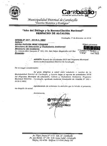 Y de acuerdo al instructivo para elaborar e implementar del Programa Municipal de EDUCCA (Resolución Ministerial N°456- 2018- MINAM), la Municipalidad Distrital de Carabayllo remite al MINAM las actividades desarrolladas el 2018 en el marco del Programa Municipal EDUCCA-Carabayllo aprobado mediante Resolución de Alcaldía N° 365-2018-MDC de fecha 04 de mayo del 2018