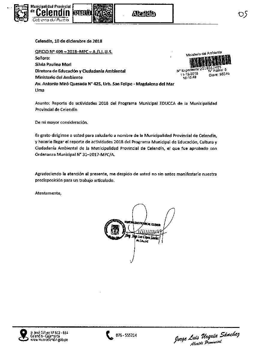 Y de acuerdo al instructivo para elaborar e implementar del Programa Municipal de EDUCCA (Resolución Ministerial N°456- 2018- MINAM), la Municipalidad Provincial de Celendín remite al MINAM las actividades desarrolladas el 2018 en el marco del Programa Municipal EDUCCA- Celendín aprobado con Ordenanza Municipal N° 031-2017-MPC/A el 11 de diciembre del 2017.