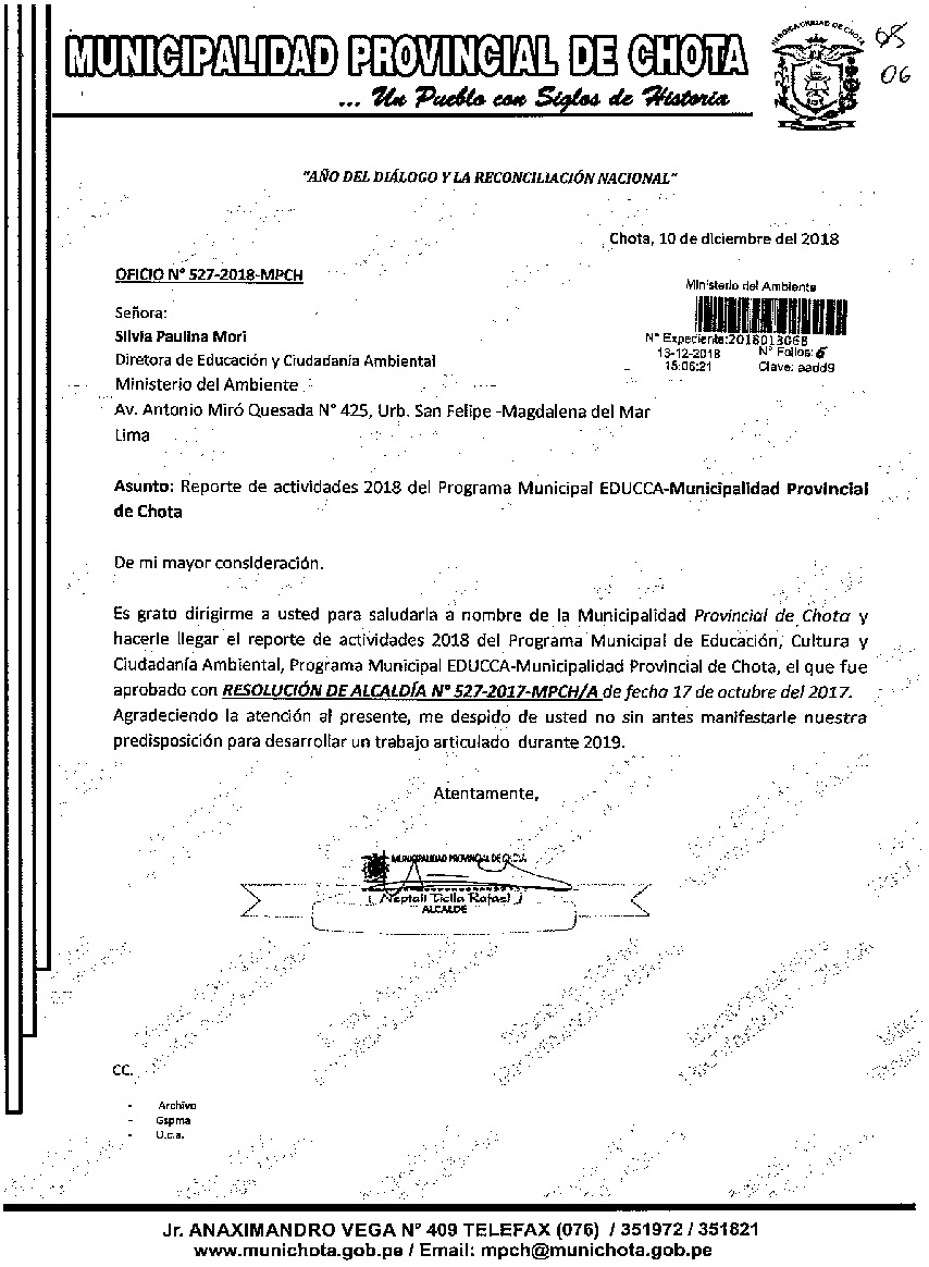 Y de acuerdo al instructivo para elaborar e implementar del Programa Municipal de EDUCCA (Resolución Ministerial N°456- 2018- MINAM), la Municipalidad Provincial de Chota remite al MINAM las actividades desarrolladas el 2018 en el marco del Programa Municipal EDUCCA- Chota aprobado con Resolución de Alcaldía N° 527-2017-MPCH/A el 17 de octubre del 2017.
