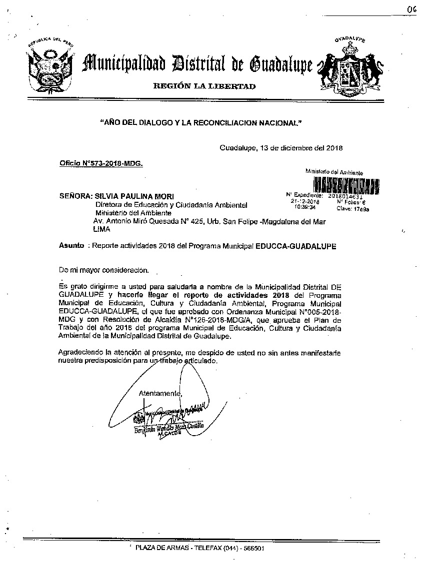 Y de acuerdo al instructivo para elaborar e implementar del Programa Municipal de EDUCCA (Resolución Ministerial N°456- 2018- MINAM), la Municipalidad Distrital de Guadalupe remite al MINAM las actividades desarrolladas el 2018 en el marco del Programa Municipal EDUCCA- Guadalupe aprobado con Ordenanza Municipal N° 005-2018-MDG el 21 de mayo del 2018.