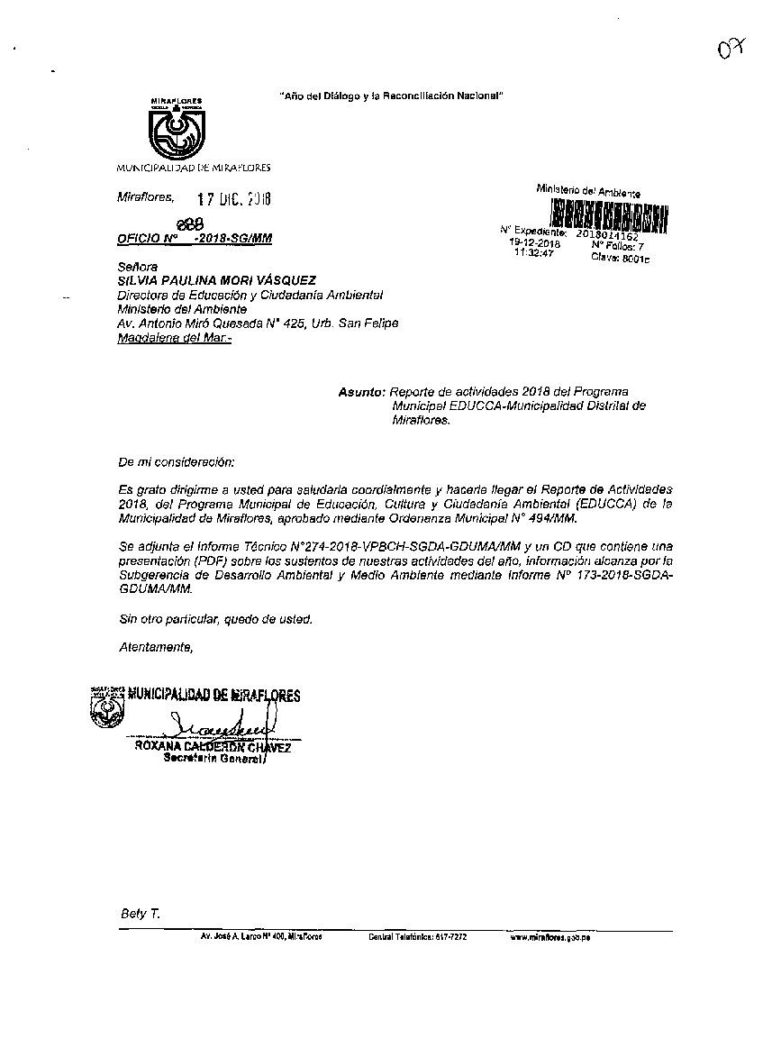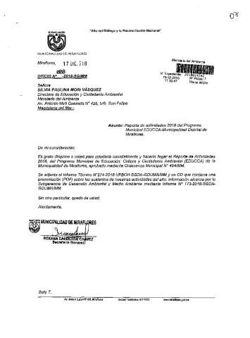 Y de acuerdo al instructivo para elaborar e implementar del Programa Municipal de EDUCCA (Resolución Ministerial N°456- 2018- MINAM), la Municipalidad Distrital de Miraflores remite al MINAM las actividades desarrolladas el 2018 en el marco del Programa Municipal EDUCCA-MIRAFLORES aprobado con Ordenanza N° 494-2018-MM de fecha 23 de febrero del 2018