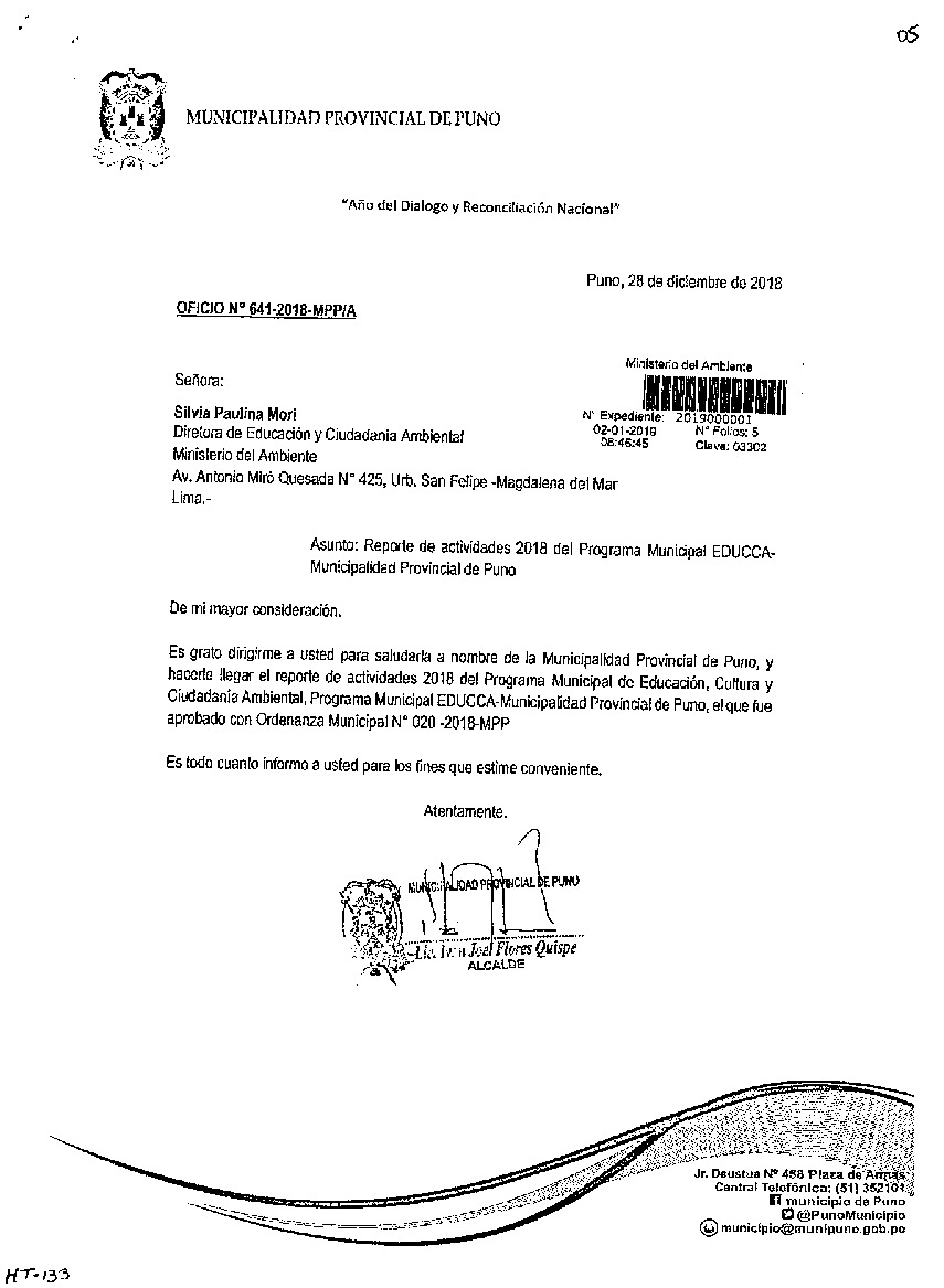 Y de acuerdo al instructivo para elaborar e implementar del Programa Municipal de EDUCCA (Resolución Ministerial N°456- 2018- MINAM), la Municipalidad Provincial de Puno remite al MINAM las actividades desarrolladas el 2018 en el marco del Programa Municipal EDUCCA- Puno aprobado con Ordenanza Municipal N° 020-2018-MPP el 03 de setiembre del 2018.