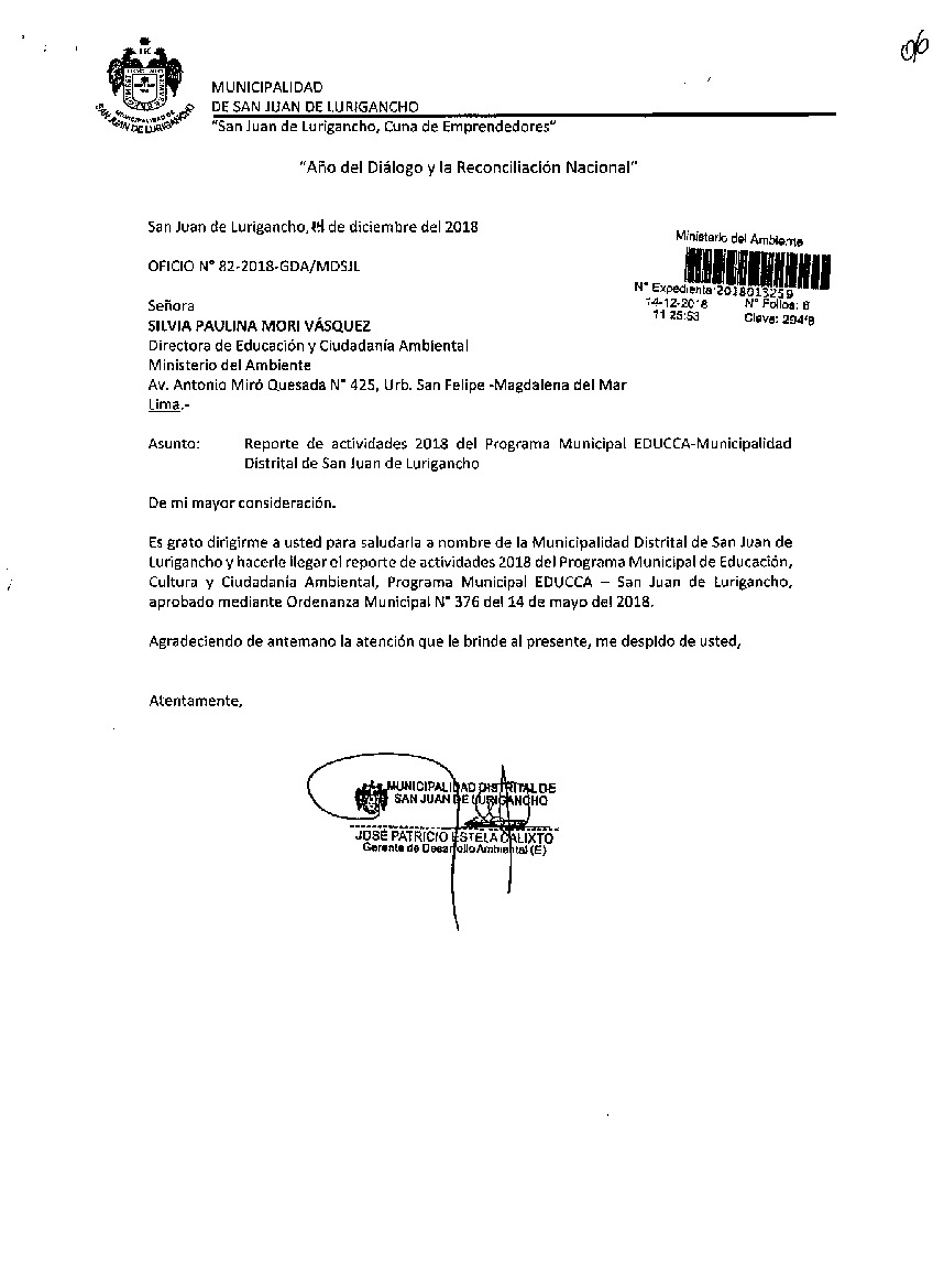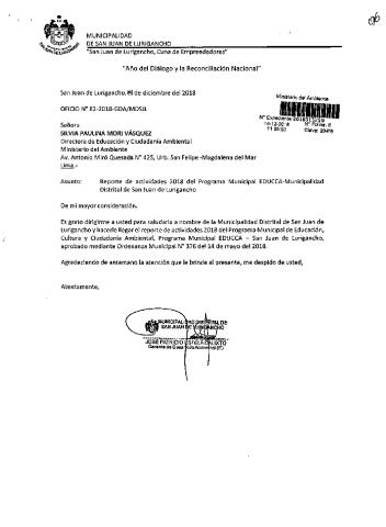 Y de acuerdo al instructivo para elaborar e implementar del Programa Municipal de EDUCCA (Resolución Ministerial N°456- 2018- MINAM), la Municipalidad Distrital de San Juan de Lurigancho remite al MINAM las actividades desarrolladas el 2018 en el marco del Programa Municipal EDUCCA-SAN JUAN DE LURIGANCHO, aprobado mediante Ordenanza N° 376 de fecha 14 de mayo del 2018