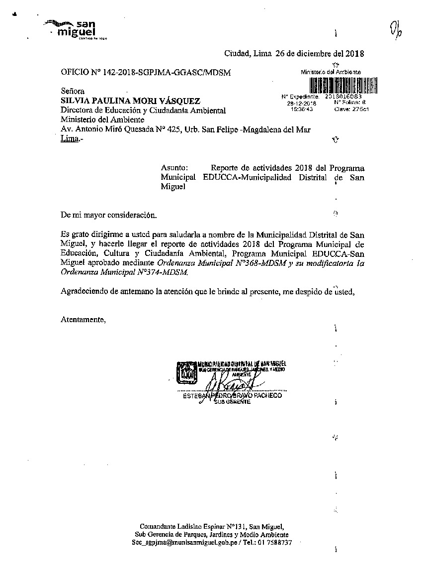 Y de acuerdo al instructivo para elaborar e implementar del Programa Municipal de EDUCCA (Resolución Ministerial N°456- 2018- MINAM), la Municipalidad Distrital de San Miguel remite al MINAM las actividades desarrolladas el 2018 en el marco del Programa Municipal EDUCCA-SAN MIGUEL aprobado mediante Ordenanza Municipal N° 374-2018/MDSM que modifica la Resolución de Alcaldía N° 129-2018-MDL, de fecha 28 de noviembre 2018
