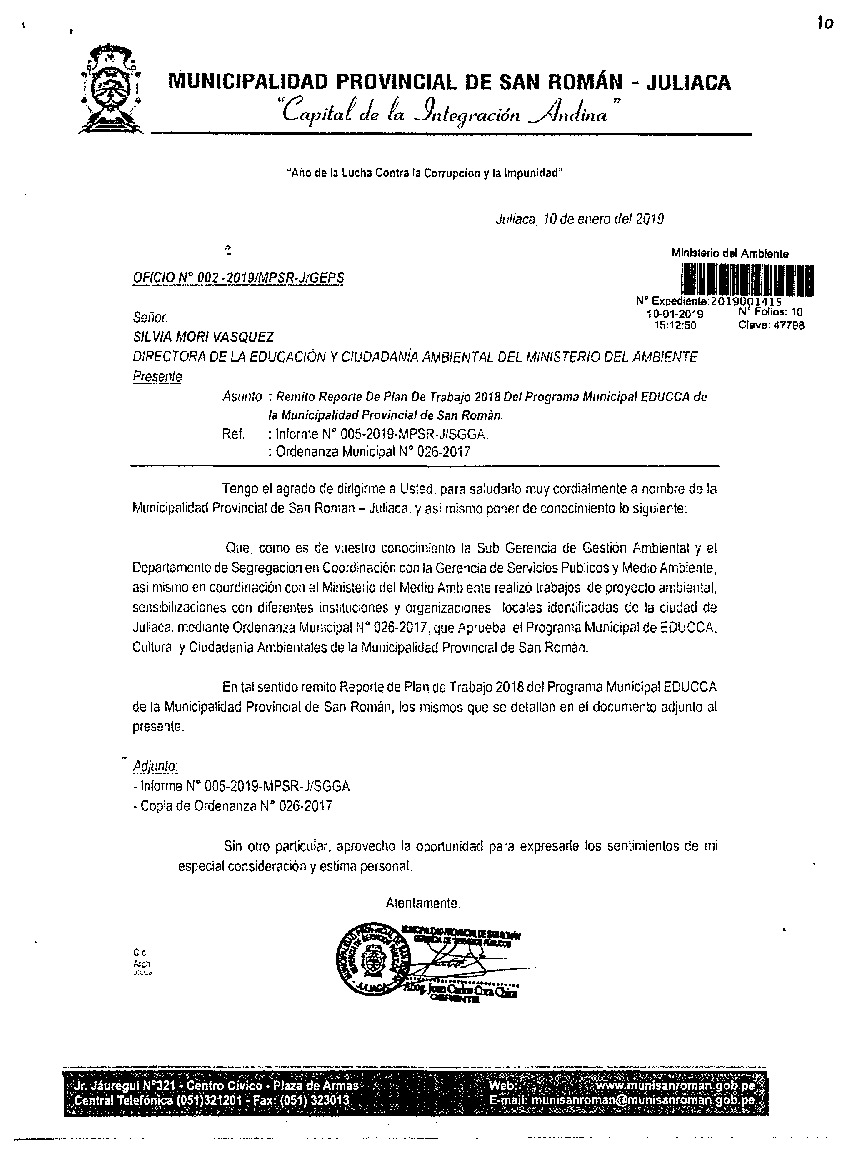 Y de acuerdo al instructivo para elaborar e implementar del Programa Municipal de EDUCCA (Resolución Ministerial N°456- 2018- MINAM), la Municipalidad Provincial de San Román remite al MINAM las actividades desarrolladas el 2018 en el marco del Programa Municipal EDUCCA- San Román aprobado con Ordenanza Municipal N° 026-2017 el 26 de diciembre del 2017.