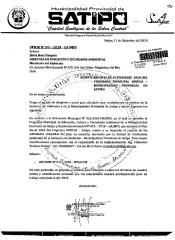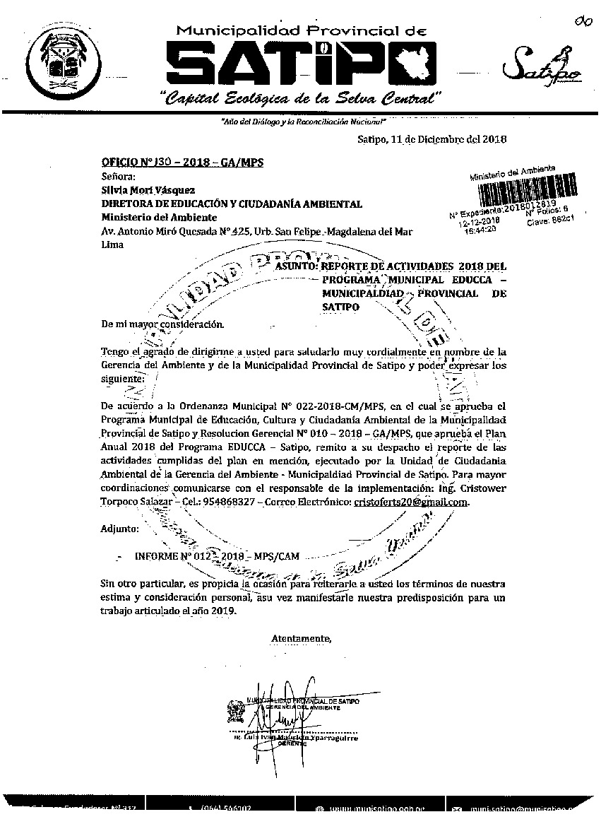 Y de acuerdo al instructivo para elaborar e implementar del Programa Municipal de EDUCCA (Resolución Ministerial N°456- 2018- MINAM), la Municipalidad Provincial de Satipo remite al MINAM las actividades desarrolladas el 2018 en el marco del Programa Municipal EDUCCA- Satipo aprobado con Ordenanza Municipal N° 022-2018-CM/MPS el 26 de junio del 2018.