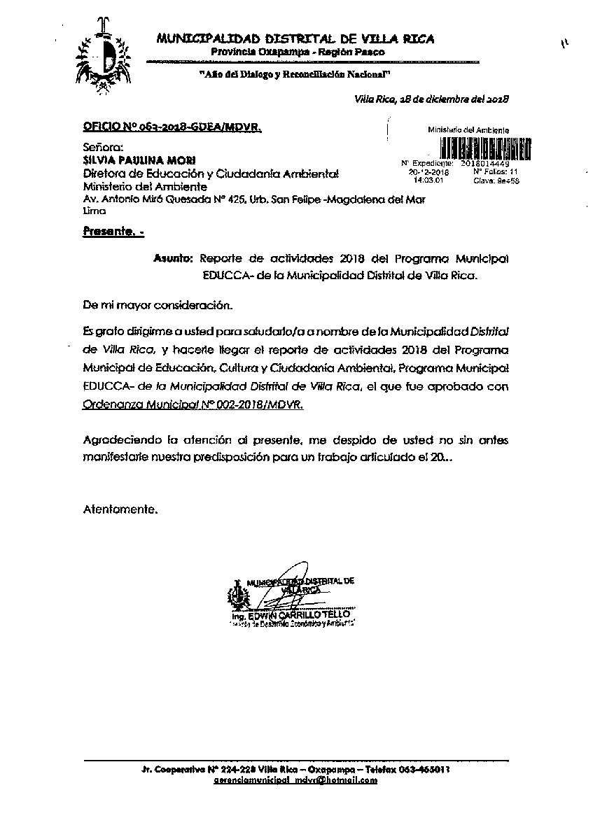 Y de acuerdo al instructivo para elaborar e implementar del Programa Municipal de EDUCCA (Resolución Ministerial N°456- 2018- MINAM), la Municipalidad Distrital de Villa Rica remite al MINAM las actividades desarrolladas el 2018 en el marco del Programa Municipal EDUCCA- Villa Rica aprobado con Ordenanza Municipal N° 002-2018/MDVR el 19 de enero del 2018.