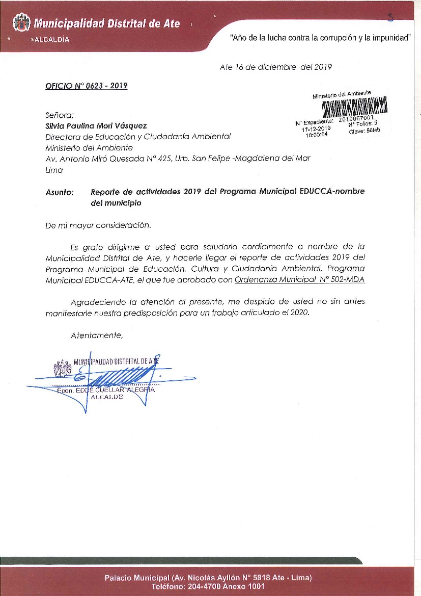 De acuerdo al instructivo para elaborar e implementar el Programa Municipal EDUCCA (Resolución Ministerial N°456- 2018- MINAM), la Municipalidad Distrital de Ate, remite al MINAM las actividades desarrolladas durante el 2019 en el marco del Programa Municipal EDUCCA.